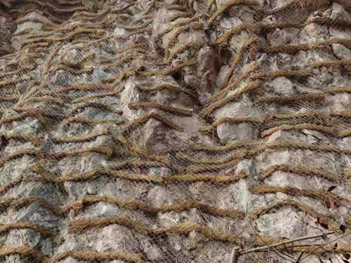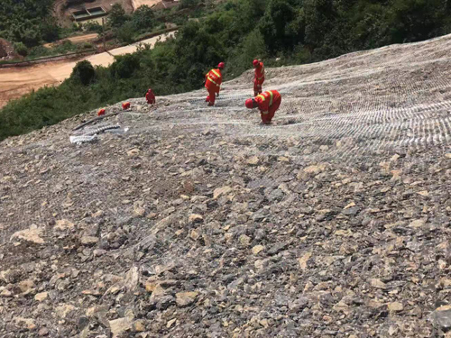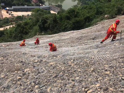 土工格镀锌铁丝网,施工开始清理坡面——坡面锚杆施工——挂土工铁丝网——安装垫板——填充农业生产体系土壤——喷播植草皮,在挂土工网时应拉紧铁丝网,14#镀锌铁丝网,网孔50*50mm 网间搭接宽度10cm,并采用不同程度的混凝土垫土调节,使铁丝网与坡面的距离保持在50-70mm。