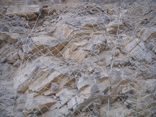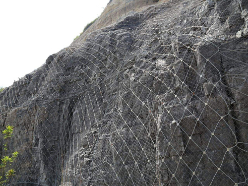 柔性防护网是以钢丝绳网为主的各类柔性网覆盖包裹在所需防护斜坡或岩石上,以限制坡面岩石土体的风化剥落或破坏以及为岩崩塌(加固作用),或将落石控制于一定范围内运动(围护作用)。